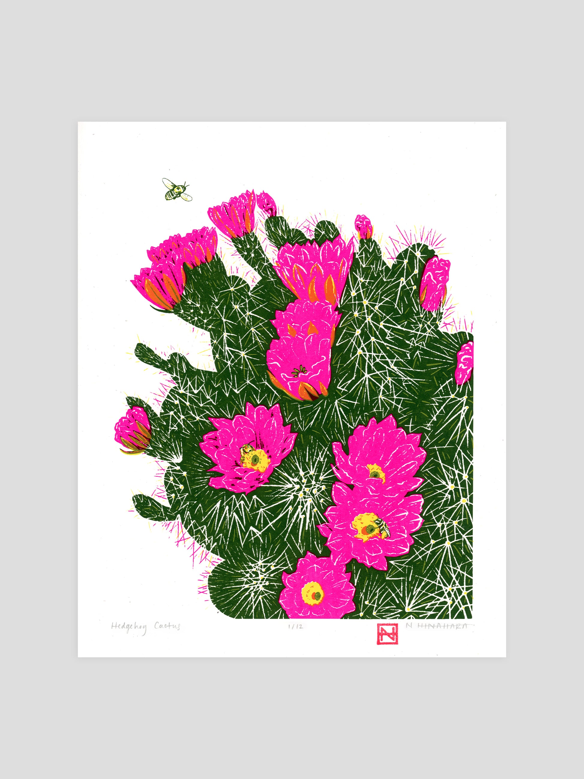 Original screenprint featuring a hedgehog cactus and mining bees. This print is featured in my Desert to Coast 2026 calendar.