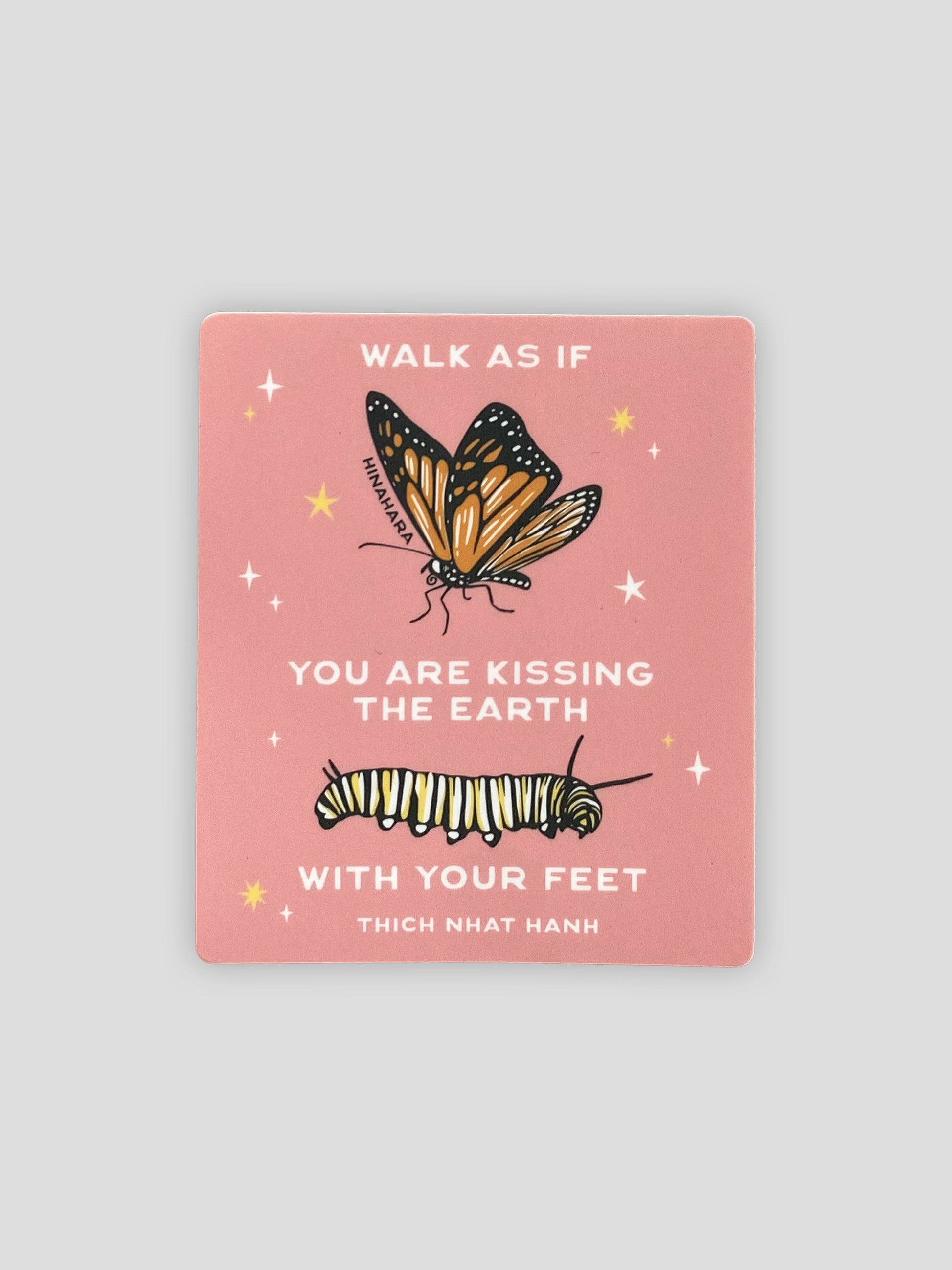 Sticker 2 features a block print image of a monarch caterpillar, butterfly, and stars on a pale pink background with the words: “WALK AS IF / YOU ARE KISSING THE EARTH / WITH YOUR FEET. - THICH NHAT HAHN”
